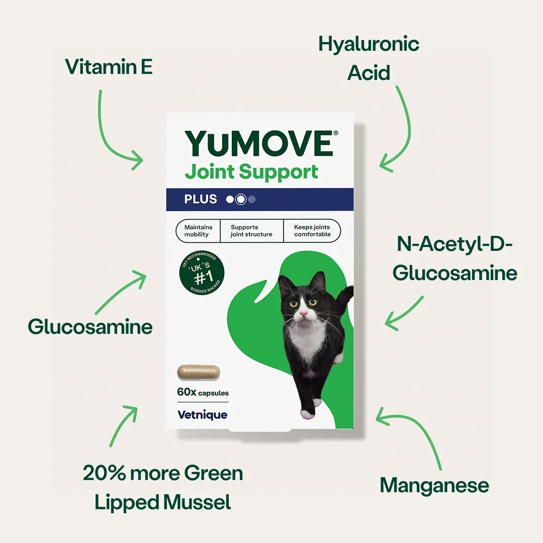 The YuMOVE Joint Care range for cats – including our new high-strength YuMOVE Joint Care PLUS – contains a unique blend of soothing Omega 3s and has been designed to aid stiff joints, help mobility and support joint structure.